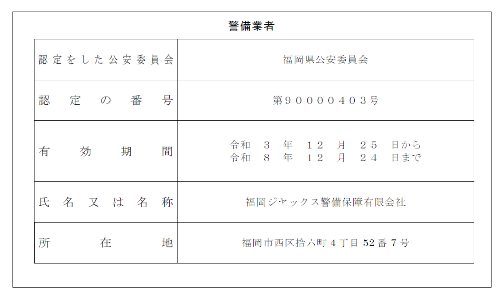 福岡ジヤックス警備保障有限会社認定番号:90000403